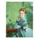 This design features a painting by the Scottish artist George Henry (1858–1943), who was one of the most prominent members of the Glasgow School of art. It is a portrait of a beautiful young woman named Felicity. She is seated at a table and she is wearing a turquoise-blue dress. Her elbows are resting on the table and she is holding her hands together beside her face. Felicity is starting intently at the viewer. She is clearly an elegant woman. Her chestnut-brown hair is fashionably styled and she is wearing a scarf over her dress, that is a slightly darker shade of turquoise than the dress itself. There is greenery in the background, suggesting that she is sitting outside in a garden. The original artwork was painted by George Henry in 1916.