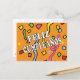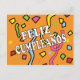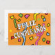 Feliz Cumpleaños Happy Birthday in Spanish for birthday ard, party fiesta celebration or greeting. Words in white on very colourful party confetti design and orange background.