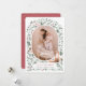 Tarjeta de navidad con una foto ovalada rodeada de un acogedor escenario inspirado en el bosque. Un elegante marco en forma de arco, decorado con hojas verdes, bayas rojas, piñas y flores, crea un borde festivo y lleno de naturaleza alrededor de su foto. En la esquina superior izquierda se posa un pajarito, mientras que un zorro se sienta debajo de su imagen. Entre el follaje hay espacio para su saludo navideño personalizado y el nombre de su familia. El reverso presenta un fondo rojo festivo con un delicado patrón de puntos blancos de nieve. Explore la colección para artículos a juego o visite nuestra tienda para más tarjetas navideñas con foto.