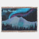 Purple and blue northern lights glow over snow-covered mountains on a cold night in Alaska. "Feliz Navidad" appears in glowing blue and white.