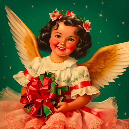 Our lovely little Latina angel wishes you "Feliz Navidad" on this Christmas gift tag. She reflects her Mexican heritage with her cheerful smile and she is dressed in colours of her native country: green, white, and red. The creamy orange gold of her wings and her dress trim go together very nicely in this retro theme.