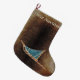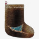 A dog sled with a teal sled bag superimposed on a digital rendering of caribou (reindeer) fur. Text reading "Season's Greetings" also appears. Spanish text reading "Feliz Navidad" appears in glowing blue and white. You may personalise the stocking by adding a bit of text on the sled bag.