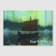 A slightly stylised image of a Viking longship sailing at night under the Northern Lights, there a couple of icebergs; most of the crew is asleep. Spanish text reading, "Feliz Navidad" appears in glowing blue and white. Add your own additional text.