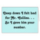 For the lovers of Jane Austen's unforgettable novel "Pride and Prejudice" a fun joke about Lizzie Bennet’s poor rejected suitor, Mr. Collins. Well, if he didn’t end up with Charlotte, he may have ended up with you! This design features the quote “Deep down I felt bad for Mr. Collins. . .So I gave him your number" on a lovely blue background. Perfect fun for your fellow Austen fans!