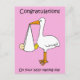 A cartoon stork holding a baby in a sheet, which hangs from it's beak. The image has a pale pink background and is accompanied by the words' Congratulations on your baby naming day'.