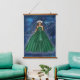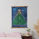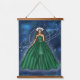 Female Capricorn goddess fashion illustration artwork on a hanging tapestry. The illustration features a woman in a beautiful green emerald ball gown. Behind her is a celestial space galaxy with her ruling planet Saturn. She has silver goat horns and a silver tiara. This earth sign female illustration is ideal for females born during the Capricorn season. Add this elegant home decor piece to your lovely home.