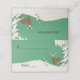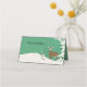This folded standing place card for your parties, events, and weddings has a brown female doe deer standing in the snow next to a tall pine tree on a mint green background. Customise the name and table number area and text on the back with the templates.