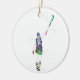 Colourful watercolor artwork of a female field hockey player holding up her stick, printed on a ceramic ornament. A modern and energetic sports design perfect for decoration or as a thoughtful gift for athletes.