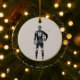 Monochrome watercolor artwork of a female soccer goalie holding a ball, printed on a ceramic ornament. A modern and artistic decoration perfect for sports lovers and athletes.