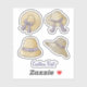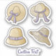 Four women beige summer hat icons with lilac bows and ribbons. Custom text.