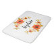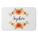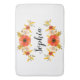 Bath mat with coral watercolor flowers on white background and customisable text.
