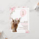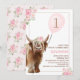 Modern and pretty holy cow themed first birthday invitation featuring a highland cow, cute pink floral arrangements and pink balloon . This girl's cow themed 1st birthday invitation is fully editable and can be used for any age.