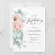 A beautifully feminine party invitation to celebrate a birthday in elegant style, this charming watercolor floral design has pink and peach roses and poppies with lovely trailing eucalyptus greenery along the left border. All of the text may be personalised for your party. This invitation is available as printed and paperless digital download.