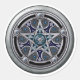 A silver feminine energy pagan pentacle surrounded by a silver ring on a silver wood shield. Chalices, a central medallion, blue water jewels, triple goddesses and celtic knotwork. Designs by Naumaddic Arts.