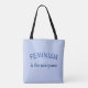The text on this all-over printed bag is in a deep blue script: "FEMINISM is for everyone". The background is light blue, and has a repeating pattern using a semi-transparent male-female symbol to emphasise inclusiveness. The two sides of the bag are identical.