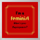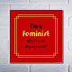 "I'm a feminist, What's your Superpower?" A fun slogan with a serious message. The text is in black lettering on a bright red background, with 'feminist' in a golden colour for emphasis.