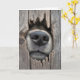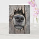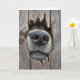 Close-up of a dog's nose and mouth poking through a jagged hole in a rustic wooden fence for thinking of you.