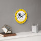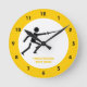 Fencer black silhouette fencing round clock that showcases a minimalist pictogram icon of a black silhouette of a fencer holding his sword and your text on white background with yellow border. This cool, modern design is a template and it is completely customizable.