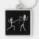Fencing design shows two duelling experts with epees and masks - demonstrating thrust and parry stances. Cool graphic for fencing enthusiasts.