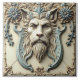 A carved garden plaque showing the wolf-like face of the Norse god, Fenrir with a beard and pointy ears, surrounded by blue-grey floral ornaments and decorative swirls, set against a cream-coloured background, intricate details, symmetrical composition, ornate design.