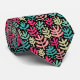 A seamless pattern made up of hand drawn fern or plant like shapes in a palette of five colours on a black background.