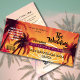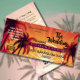 Festival theme Wedfest Wedding invitation. Featuring palm treesa ferris wheel and a sunset.