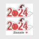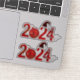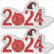 Merry Christmas and New Year illustration: red bold year number 2024 decorated with colourful light chain, red glitter christmas tree ball, Santa Claus hat, silver glamour tinsel and silver snowflake.
