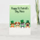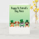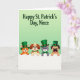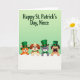 Designed with a pale green gradient background that grows lighter toward the top, this St. Patrick’s Day card sets a soft, festive scene. Near the upper area, a dark green greeting sits centered in flowing lettering, giving the message a gentle spotlight 💚. Across the lower portion, a wide white horizontal band stretches from side to side, and four friendly animals peek over it as if leaning in close to share the moment. On the left, an orange cat with rosy cheeks wears a green top hat, its bright eyes angled toward the others like it’s in on a sweet joke. Next, a spotted dog smiles wide with a green collar and a gold buckle, nudging the group’s togetherness with an easy, welcoming look ☘️. A gray cat follows in an emerald top hat and matching bow tie, holding a calm, affectionate gaze that feels like a quiet compliment. On the right, a fawn-colored dog in a sturdy green hat tilts its head with a curious expression, and the white band stays crisp beneath their paws.