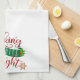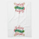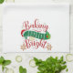 This festive holiday kitchen towel features the phrase "Baking Spirits Bright" in Christmas red, green and gold colours. Design includes a Santa hat, holly with berries, Christmas cookies and starburst accents.