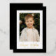 Cute holiday photo card featuring your vertical photo framed in white with a background of black and gold foil snowflakes. "Warm Wishes" is displayed in a whimsical gold foil script. Personalise the snowflake holiday photo card with the year and your family name. The card reverses to display your custom message in white lettering with a solid black background.