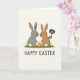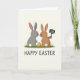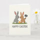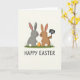 Designed with two rounded bunny characters facing each other, this card shows a grey figure with pink inner ears and a warm brown companion with soft pink accents, their rosy cheeks and tiny red noses giving them a tender, friendly look 🐰. They stand close on a strip of green grass, angled inward as if sharing a quiet moment together. Between them sits a golden-orange egg filled with fine geometric lines, drawing the eye to the centre. The brown bunny holds a phone on an extended pole, lifted slightly above their heads as if capturing a cute snapshot 🐇. The simple cream background keeps the scene uncluttered and lets the pair’s closeness feel more noticeable. Below the illustration, a short Easter greeting is placed near the bottom in a casual, handwritten-style font, coloured in a soft coordinating tone. Small details like the pink ear interiors, the blush on their cheeks, and the patterned egg add gentle contrast against the pale backdrop. The phone-on-a-stick points upward while the egg rests neatly between them on the grass.