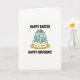 This greeting card features a multi-tier celebratory cake centered on a bright white background, drawn with smooth lines and a soft palette of blues and whites with accents of pink, green, yellow, and orange. At the top, four colorful candles stand upright with small flame shapes, adding a sweet, wish-making touch. The middle tier is decorated with tiny orange root vegetables, arranged like a shared inside joke between close friends. Along the wide bottom tier, several small long-eared animal figures in warm brown sit together among little golden starbursts, their gentle closeness suggesting an affectionate bond 🐰. The cake rests on a golden-yellow stand that frames the design like a sunny tabletop. Above the cake, a bold greeting in dark lettering is centered near the top, and a second line of matching text sits below the stand to balance the layout 🌷. Small orange carrots dot the middle tier while the brown long-eared figures line the base beside scattered golden bursts.