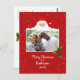 A cartoon Santa looking cute and cheerful in a snow flurry! holding up a photo frame in Christmas red with a white border titled “Merry Christmas” - adorned with a very festive green and red holly sprig bearing your name or a message of love and festive greetings.