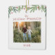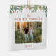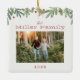 This Christmas ornament features trendy hand-drawn winter greenery along the top with a clean white background. Personalise with your family name, photo, and date.