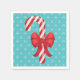 This napkin features Destei's festive and cute red and white cartoon illustration of a delicious Christmas candy cane with a beautiful red bow. The background colour is blue with a snowflake pattern.