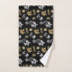 Cute Christmas themed bath towel set design featuring snowflakes, Santa Claus, Christmas socks and snowmen in faux gold and silver on black background.