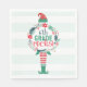 Festive elf holding a Christmas foilage wreath. The elf is wearing a red and gold star hat and stripe stockings with green elf boots.