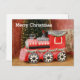 A photo of a red steam engine locomotive train, with snowflake accents and green trim. The background has a faux holiday Christmas tree. The text reads Merry Christmas and the back says Best wishes for a wonderful holiday season. You can personalise it with your own text and personal message. These postcards are great for train lovers.