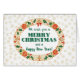 A festive Christmas card, with a Christmas wreath of Holly, Ivy, Poinsettias, Fir Cones, Christmas Roses and a matching red bow, outlined in gold-effect, with gold-effect snowflakes on a white background. A custom front card in this series is also available.