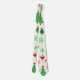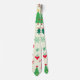 The image is a pattern of Christmas-themed illustrations on a cream background. The illustrations include Christmas trees of various sizes, ornaments in red, yellow, and green, candy canes, snowflakes, holly leaves and berries, poinsettias, and wrapped presents. The style is whimsical and childlike, with simple shapes and bright colours.