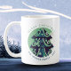 Festive Christmas Tree Family Name Coffee Mug. Festive decorated Christmas tree in a circle frame, surrounded by merry Christmas text, family name and year - personalise the mug.