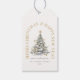 Festive watercolor snowy Christmas tree, modern holiday gift tags.