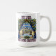 A beautifully decorated window frames a snowy outdoor scene featuring twinkling lights and lush evergreen trees. Candles on the window sill illuminate the cosy interior, enhancing the holiday spirit.
