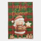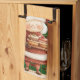 Classic red, green, gold tartan Merry Christmas kitchen towel, with a Mrs. Claus design. (c) The Happy Cat Studio