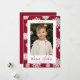 Cute holiday photo card featuring your vertical photo framed in white with a background of cranberry and white snowflakes. "Warm Wishes" is displayed in a whimsical cranberry script. Personalise the snowflake holiday photo card with the year and your family name. The card reverses to display your custom message in white lettering with a solid cranberry background.