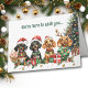 Four watercolor cute Dachshund Dogs wear their Holiday attire and sit with gift packages on the front of this Christmas card. Three of them wear red and white Santa hats, and one wears antlers. The text above says "We're here to wish you...", and the sentiment is continued inside. The text is all customisable, so you may make it say whatever you'd like. See more cat and dog images and products at Dog Village.