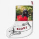 Festive Dog Photo and Name Ribbon Small Christmas Stocking. Festive design with a dog`s name on a classic ribbon and a custom photo. Personalise the stockings for your dog - add your dog`s photo and personalise it with the name. Plenty of room for dog treats and a great keepsake.