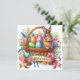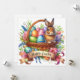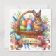 This is an Easter-themed illustration featuring a wicker basket filled with brightly coloured, decorated eggs. A cute brown bunny sits in the basket surrounded by spring flowers and other greenery. The basket is adorned with a ribbon that reads "Happy Easter" in elegant script. The overall design is cheerful, vibrant, and festive, evoking the joy of spring and Easter celebrations.