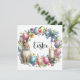 This is a festive Easter-themed illustration. The central elements include: a cute, brown bunny, a collection of pastel-coloured Easter eggs, various flowers and foliage, a lit candle in an ornate holder, a ribbon bow and a butterfly, further enhancing the celebratory and whimsical atmosphere.