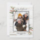 This festive, cosy farmhouse style holiday photo card features your photo with a black trim, 'Merry Christmas' in hand lettered script, a white barn wood texture background, and festive winter watercolor greenery and berries. The back of the card features a black and white buffalo plaid. Copyright Anastasia Surridge for The Christmas Shop, all rights reserved.